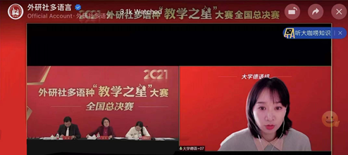 大赛评审组长赵劲老师(教育部高等学校大学外语教学指导委员会副主任委员,全国大学德语四、六级考试委员会负责人)在赛后总结道:“本次参赛老师既有理论意识,又有很强的课堂组织能力。从课程思政到知识、能力、素质教育的课堂融合,运用信息技术,以产出为导向、以学生为中心进行交际教学,体现了很强的教学水平。”