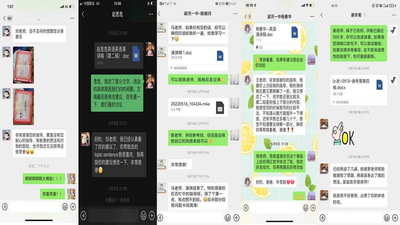 教研小组成员马倩、刘玉姣、刘芋蔓、王婉和罗哲教师与梁河一中参赛教师结成对子,利用五一假期和课余时间,一对一在线帮助参赛教师打磨讲稿、纠正语音,极大地提升了参赛教师的写作和演讲技能,受到了当地教师们的好评和认可。
