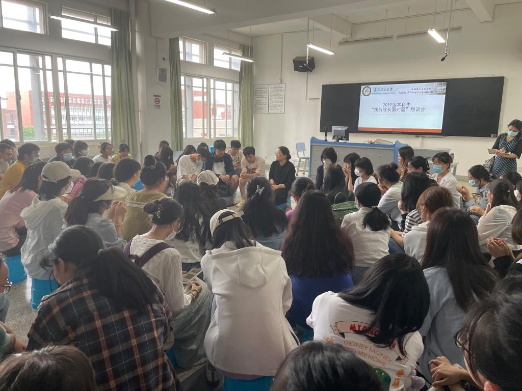 面向2019级本科生开展“我与院长面对面”恳谈会,院长王英、教务办主任及副主任、2019级辅导员及班主任、2019级全体本科生参与会议。