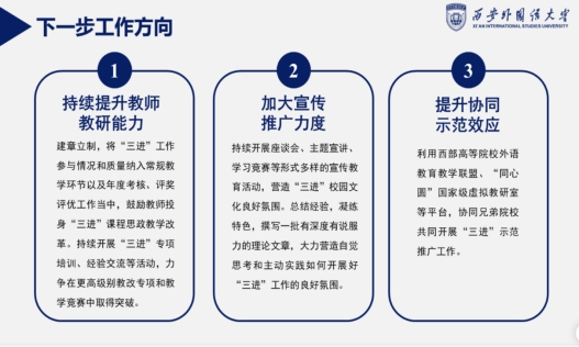 专家做课程顾问,并定期进行教研指导。同时积极将《习近平谈治国理政》融入大学生公共英语和研究生公共英语教学,计划针对全校研究生开设英语类拓展课程《理解当代中国英语演讲》。