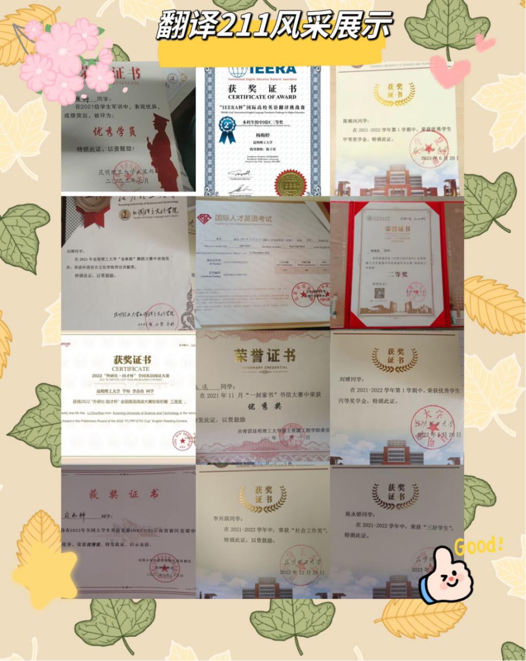 2021级本科专业翻译211班荣获2022-2023学年云南省“省级先进班集体”,这是我院近十年来第一次荣获“省级先进班集体”荣誉。