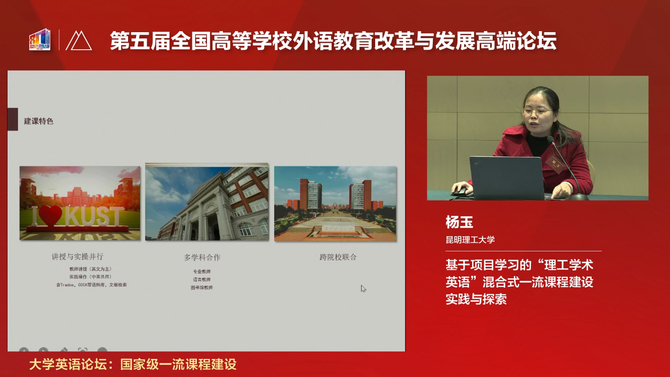 杨玉教授受邀参会,并在大学英语国家级一流课程建设专题论坛中以“基于项目学习的‘理工学术英语’混合式一流课程建设实践与探索”为题进行了专题发言和交流。