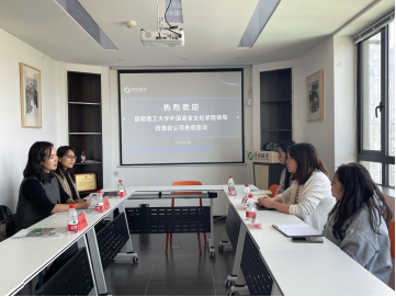 副院长马倩、翻译硕士教育中心主任马群英等一行到访昆明译诺翻译服务有限公司,就本科毕业生实习合作交流进行座谈。昆明译诺翻译服务有限公司总经理字敏和相关负责人参加了座谈会。