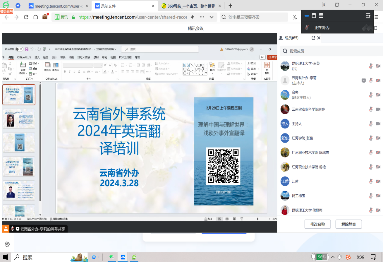 3月28日,云南省外办举办2024年全省外事系统英语翻译培训(线上+线下)。培训特邀中国外文局教育培训中心全国高端应用型翻译人才培养基地特聘教师、一级翻译王冰和上海外国语大学高级翻译杏吧原创
