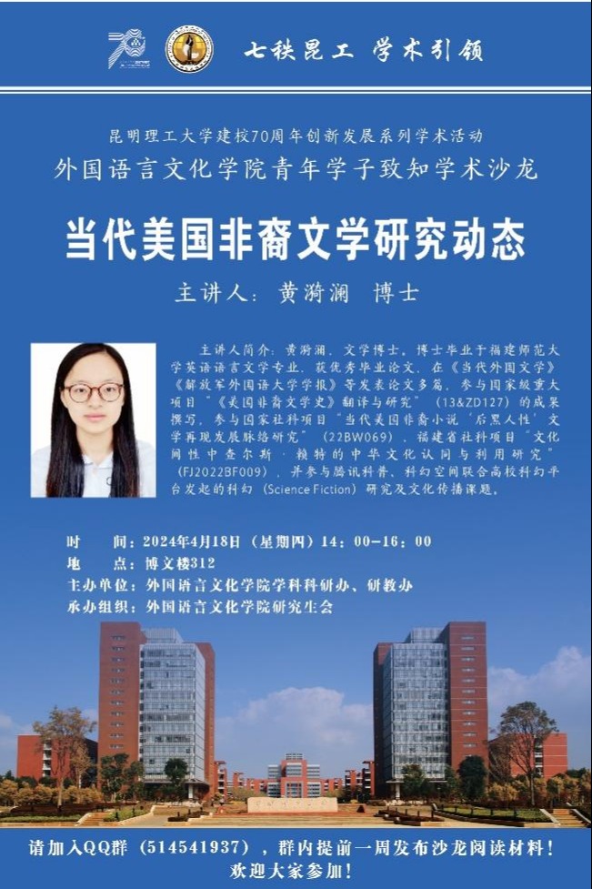 在博文楼312会议室开展了2024年第一期青年学子致知学术沙龙活动。此次学术沙龙的主题为“当代非裔文学研究动态”,特邀杏吧原创
