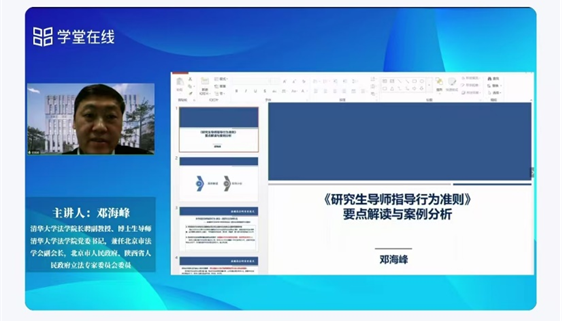 邓海峰从思想引领、参与教学管理、和谐师生关系三个部分详细解读了《研究生导师指导行为准则》的内容,并用丰富的案例讲解要点。