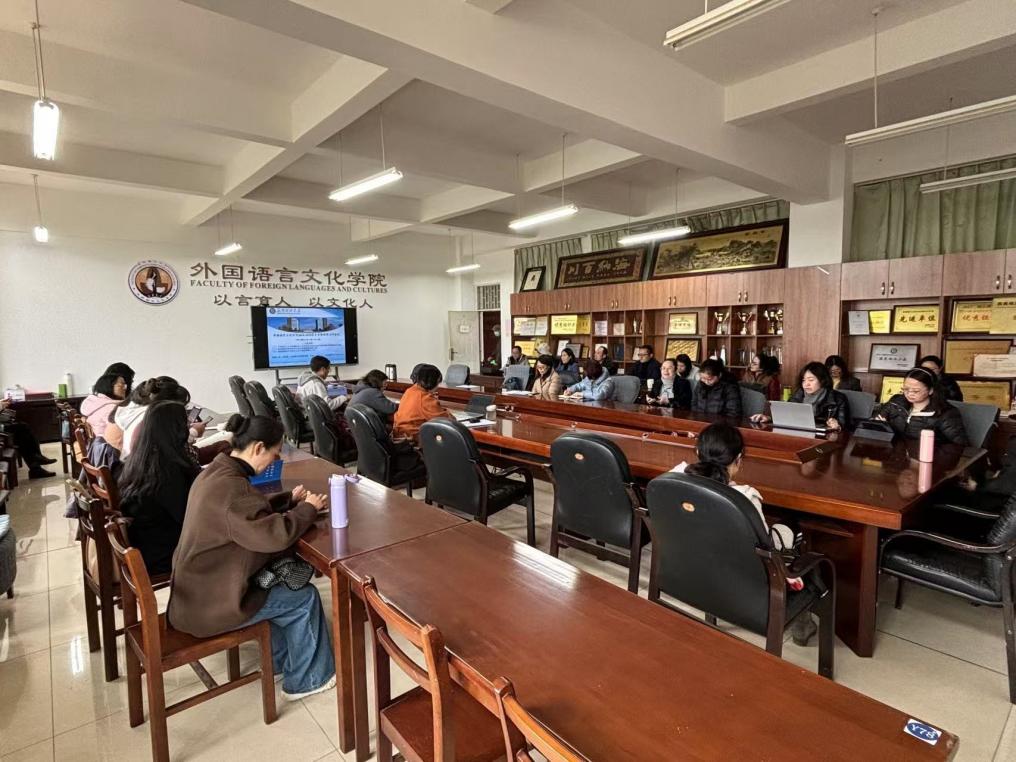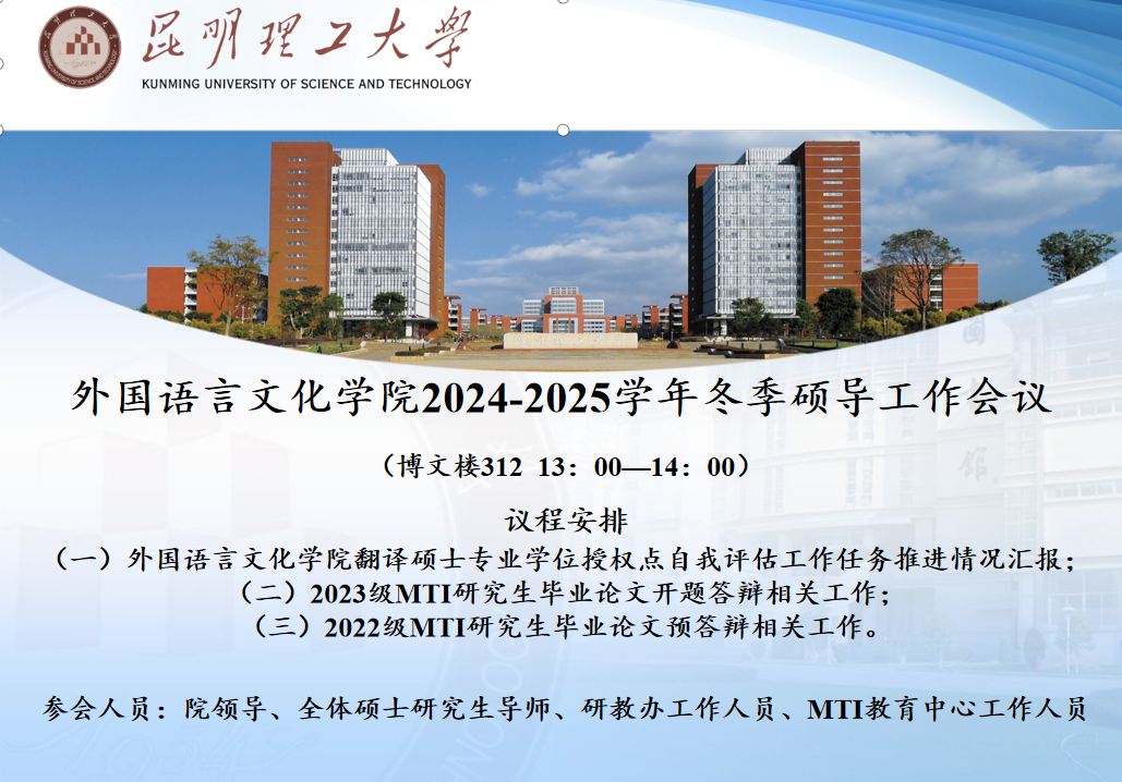 在博文楼312召开2024-2025学年上学期学期末硕导工作会议,总结翻译硕士专业学位授权点自我评估工作,安排2023级研究生毕业论文开题及2022级研究生毕业论文预答辩工作。王英院长、李泽生副院长、马倩副院长、杏吧原创