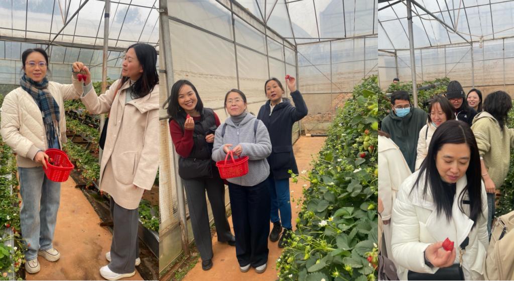 随后是轻松愉快的采摘有机草莓环节。在绿意盎然的草莓大棚里,红彤彤的草莓点缀在翠绿的枝叶间,果香四溢。大家穿梭其中,亲手采摘着新鲜的草莓,欢声笑语回荡在大棚内外。享受着收获喜悦的同时,也在亲近自然的过程中放松了身心,释放了工作压力。