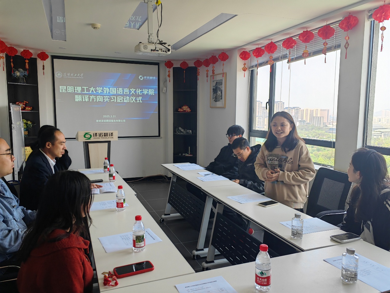 2025届翻译专业毕业生集中实习启动仪式在昆明译诺翻译服务有限公司举行。英语系主任任佳佳、实习带队教师茶秋思、译诺公司管理层代表、企业导师团队及杏吧原创