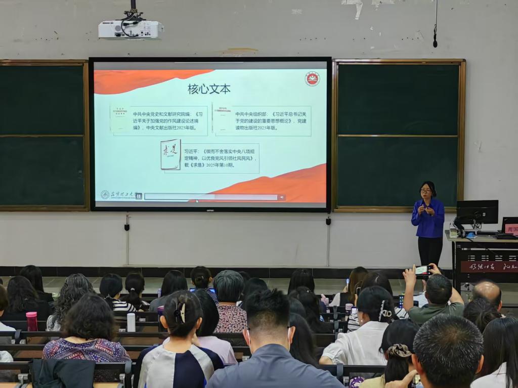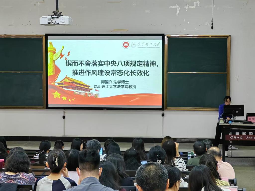 周国兴教授以“锲而不舍落实中央八项规定精神,推进作风建设常态化长效化”为题,从中央八项规定及其实施细则的出台背景及其演进、中央八项规定及其实施细则的制度要求及功能定位、违反中央八项规定精神的典型案例分析等方面进行宣讲,强调中央八项规定及其实施细则是新时代中国共产党推进全面从严治党、深化作风建设的重要制度成果,具有纪律约束、政治引领、制度保障、文化塑造等方面的复合效能,要扎实开展深入贯彻中央八项规定精神学习教育,党员干部要强化作风建设,增强贯彻执行的自觉性主动性。