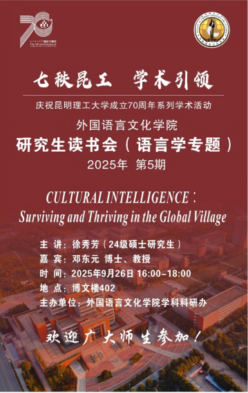 语言学专题读书会于9月25日在线上开展。本次读书会由2024级硕士研究生徐秀芳主讲,特邀我院邓东元教授担任点评嘉宾。读书会围绕David C. Thomas与Kerr Inkson合著的Cultural Intelligence: Surviving and Thriving in the Global Village展开,系统梳理了“文化智力”(CQ)的理论框架、实践路径以及在中国语境下的反思。通过对比智商(IQ)、情商(EQ)与CQ的核心差异,强调CQ不仅引导我们管理自我与关系,它更是驱动我们在文化差异的碰撞中,能够重塑行为边界。总结环节,邓东元重点阐释了CQ四因子模型,即Drive(动机)、Knowledge(知识)、Strategy(策略)、Action(行动),并给出三大情景任务,引导同学们进行分析;最后,邓东元要求同学们在课后能够充分将Drive-Knowledge-Strategy-Action四步升级路径运用到实际场景分析当中,整场活动在“知—思—行”的闭环中结束,同学们兴趣盎然,积极参与。本次读书会为师生们持续深耕跨文化研究提供了新视角,开拓了新思路,注入了新动能。