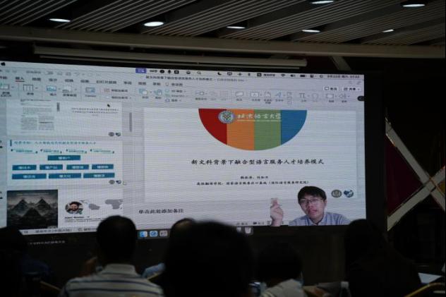 北京语言大学外国语学部高级翻译杏吧原创 韩林涛博士在英国线上参会。他的发言以《新文科背景下融合型语言服务人才培养模式》为题,探讨了在新文科背景下融合型语言服务人才培养模式、路径和体系。语言服务与传统的外语和翻译既有传承,也有创新。其独特之处体现在“融合”上。报告围绕如何根据市场需求设计培养方案,如何解决外语学科与专业的有机融合,如何通过政产学研一体化融合驱动语言服务课程体系升级,先前的探索如何在新文科背景下形成体系和模式等问题进行思考。