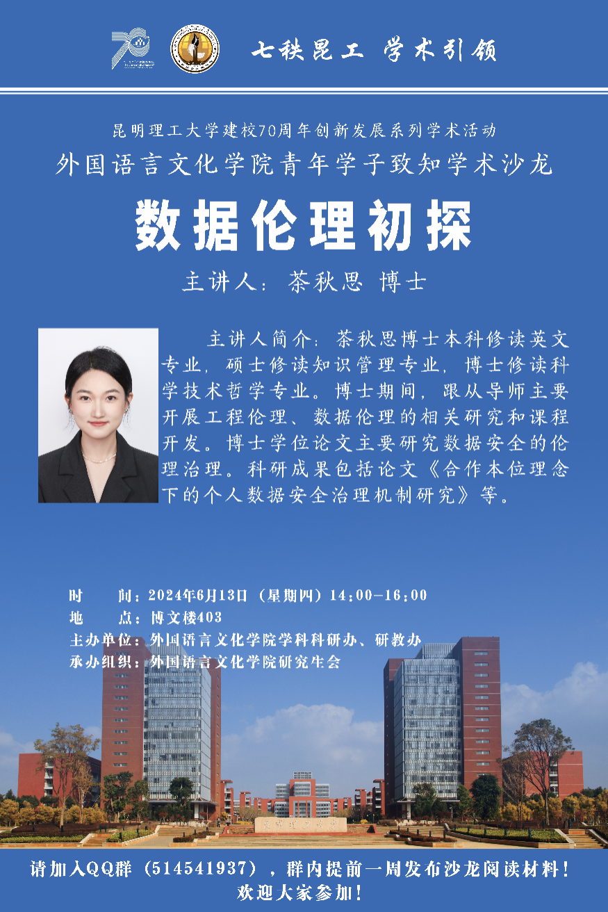 茶秋思基于其个人研究成果,带领学生深入了解数据伦理这一研究领域,讲解了伦理学的基本理论,如功利主义、义务论、权利论和规范性原则等。她还与学生共同分析和讨论经典数据伦理案例,指出了大数据技术带来的隐私泄露、信息安全和数据鸿沟这三大伦理问题。最后,茶秋思与学生一同探讨了法律与伦理以及道德的关系,她强调道德具有前瞻性和适应性,道德教育至关重要。