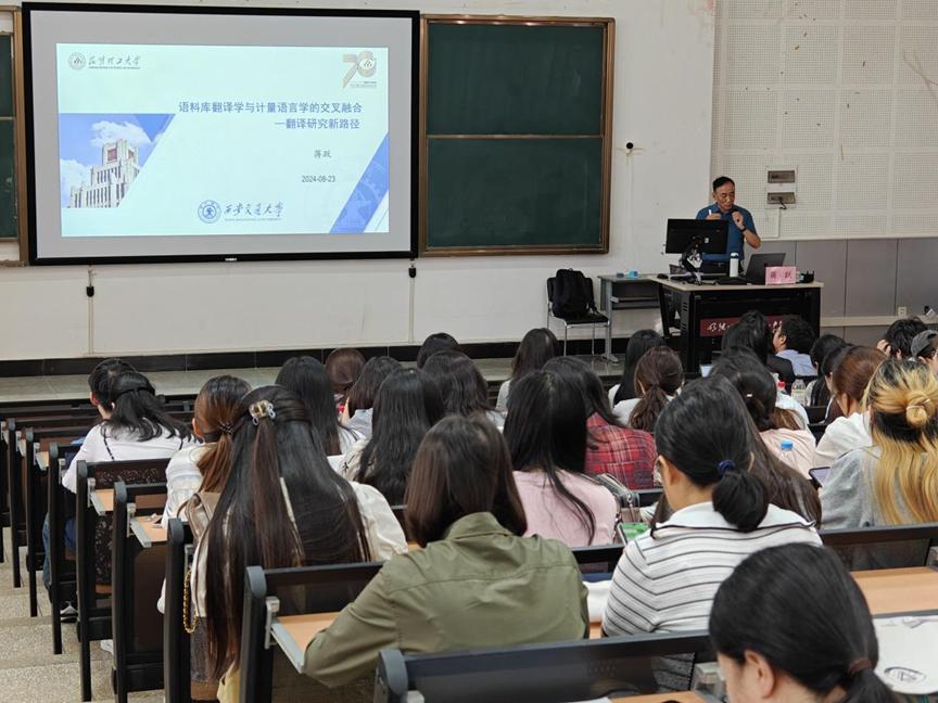 专题讲座的主题为“计量语言学与语料库翻译研究”。蒋跃首先以“外语教师与实证研究的一场艳遇——以西安交大计量语言学与翻译研究团队为例”为题介绍了实证研究方法在国际发表中的重要意义,并通过具体的实例鼓励在场的老师和研究生们重视、学习和应用实证研究方法。在题为“语料库翻译学与计量语言学的交叉融合——翻译研究新路径”的讲座中,蒋跃在比较语料库翻译学和计量语言学的基础上,分析了两者结合的必要性和优势,并通过实际案例阐释了语料库翻译学和计量语言学研究交叉融合的学科意义。