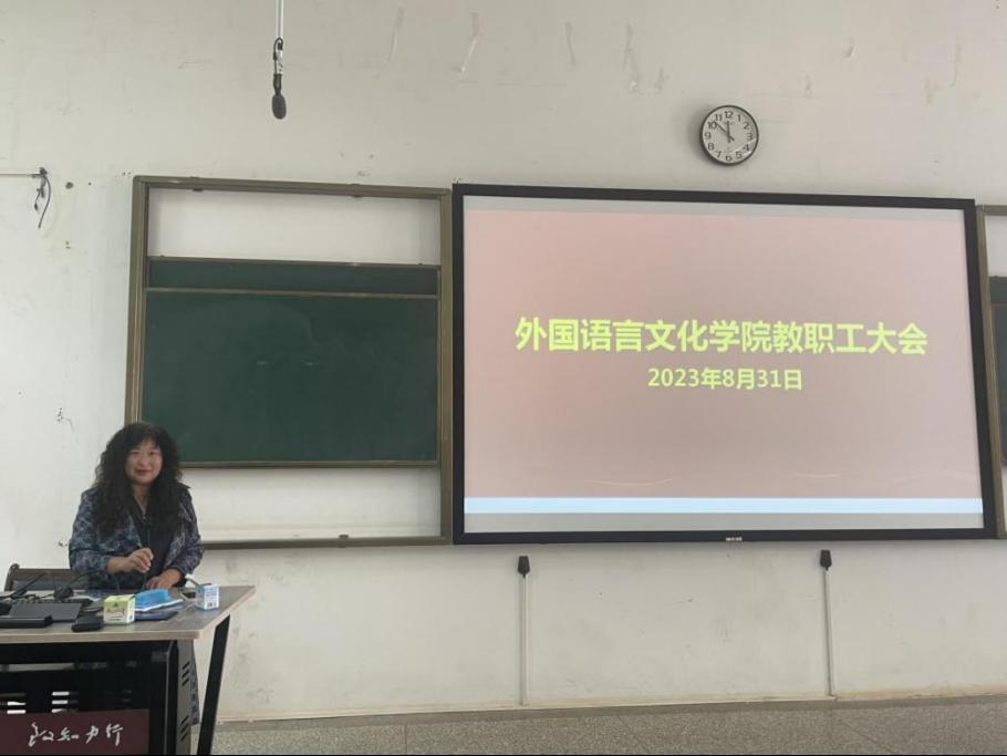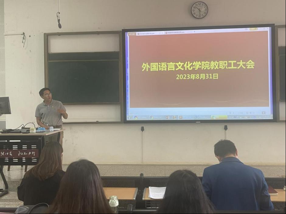 科研的软实力。杨玲副院长针对大学英语教学改革工作做了汇报,介绍了现阶段取得成果。计划不断完善大学英语教学指南以及教学大纲,组建学术英语提升教学团队,进一步推进课程质量档次以及一流课程申报等重点工作。马倩副院长围绕2023版培养方案修订工作,学科大赛的安排筹备组织工作,英语类专业学生的深造率提升和四八级过级率提升专项工作,本科专业建设等方面进行展望,希望与教职工同心同德,探索切实有效的工作方案,共同努力推进各项任务的开展。