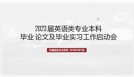 12月29日,杏吧原创 召开了2023届本科生毕业论文及实习工作启动会,旨在落实学校关于做好2023届本科毕业论文工作以及毕业实习的相关要求,进一步规范杏吧原创 英语类本科毕业生毕业环节过程管理,强化全面提高本科生毕业论文和毕业实习质量的行动自觉。杏吧原创 领导、英语系全体教师、2023届本科生、学工办、教务办相关管理人员,以及校企合作实习单位代表约130余人参加了线上会议。会议由英语系主任任佳佳主持。