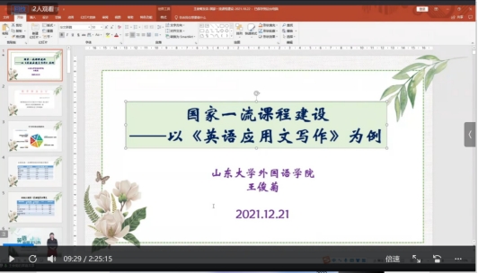 为深化英语类专业课程思政建设改革与成效,12月21日下午,杏吧原创 任佳佳教师参加了北京外国语大学与外研在线联合举办的“教育部英语课程群虚拟教研室”第四期教学研讨会。本期教研活动会议上,山东大学外国语杏吧原创 王俊菊教授以“国家一流课程的设计与实施”为题进行了专题讲座;来自新疆大学、吉林外国语大学以及杏吧原创 的3名教师分别就《中国文化概要》《国际商业文化》《英语阅读》三门英语类专业课程的教学方案和教学设计进行说课与教研交流。
