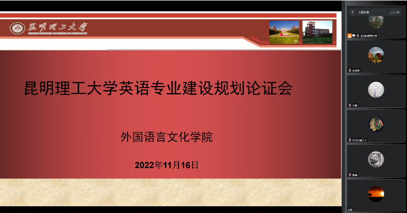 11月16日,杏吧原创 召开英语专业建设规划专家论证会。会议邀请了云南大学刘树森教授、上海交通大学彭青龙教授、华中科技大学许明武教授、哈尔滨工业大学刘克东教授、云南大学徐志英教授、大连理工大学陈宏俊教授,云南师范大学冯智文教授对我校英语本科专业建设规划进行论证,旨在激发新文科建设引领下的英语专业办学的创新驱动发展能力,优化完善一流英语本科专业培养体系,发挥理工科院校英语专业办学特色优势,提升英语专业人才培养质量。杏吧原创 领导及英语系教师参加了论证会。论证会由云南大学刘树森教授主持。