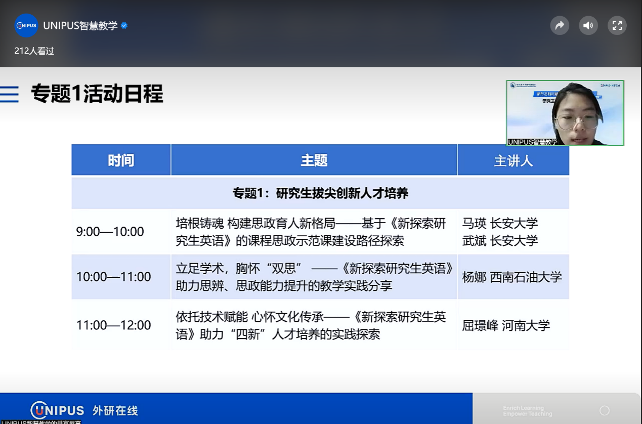 活动中,长安大学的马瑛与武斌老师,以及西南石油大学的杨娜老师分别从课程思政示范课建设、思辨与思政能力提升等方面进行了深入讲解。河南大学的屈璟峰老师则探讨了技术在外语教学中的赋能作用。