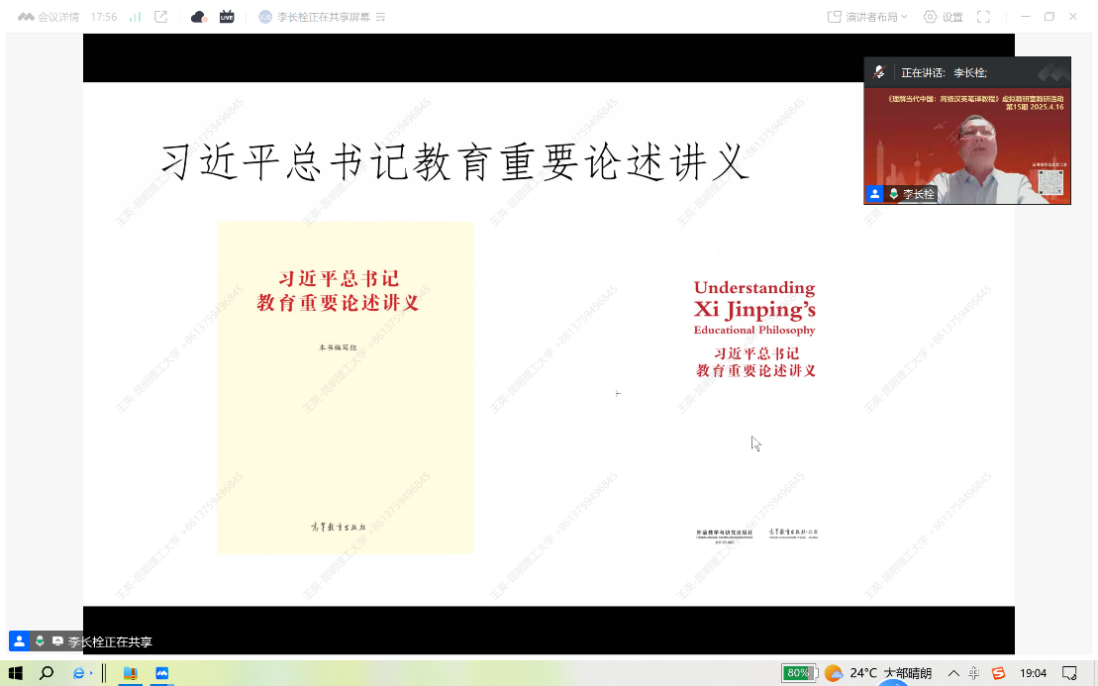 本次研修活动的主题为“中国特色话语体系翻译实践与探索——《习近平总书记教育重要论述讲义》的翻译与使用”,由《高级汉英笔译教程》主编、北京外国语大学教授任文主持,副主编李长栓教授主讲。李长栓教授结合自身丰富的翻译经验,深入讲解了中国特色话语体系的翻译要点与实践方法,强调了贴近中国实际、贴近国外受众需求和思维习惯的重要性,并分享了如何精准传递中文语境中的教育文化内涵。