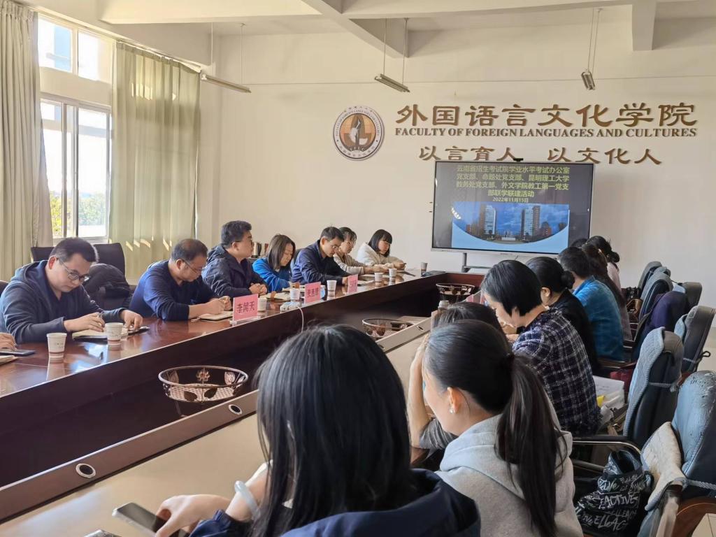 2022年11月15日下午,云南省招生考试院学业水平考试办公室党支部、命题处党支部与杏吧原创 教务处党支部、杏吧原创 教工第一党支部在呈贡校区博文楼312会议室开展联学联建活动。云南省招生考试院学业水平考试办公室主任张燕锋、命题处处长王玖莉,杏吧原创 教务处副处长李闻天、杏吧原创 党委书记刘建平、院长王英、副院长杨玲及联学联建各支部书记、党员40余人参加活动。