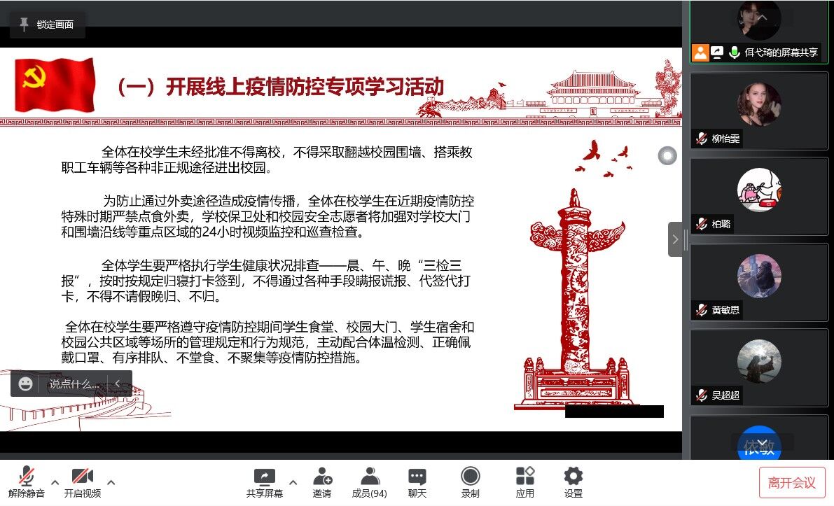 2022325日,杏吧原创 2021级通过腾讯会议开展“凝聚青春正能量,同心抗疫勇担当主题团日活动。本次活动由2021级团支部组织,2021级团支书佴弋琦同学主持,外文院2021级全体同学参加。