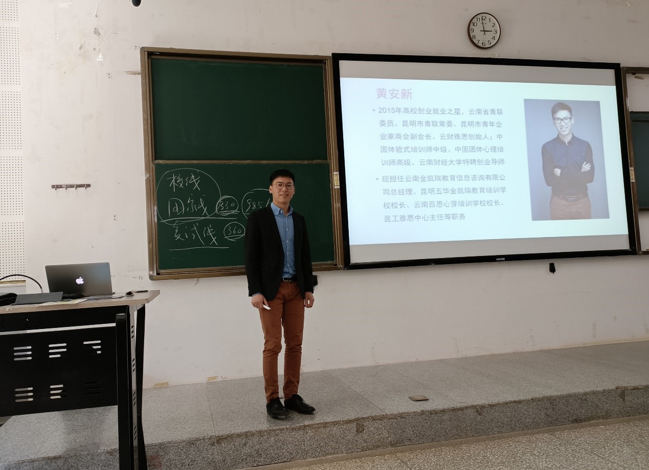 13:30,讲座正式开始。首先,黄安新老师向同学们介绍自己以及讲座的大致内容。接下来,黄老师以自身经历去引导同学们做好人生规划,并讲解就业方向和考研的相关知识。最后,黄老师与同学们进行交流互动,帮助同学们答疑解惑并推荐适合外语专业留学的高等院校。