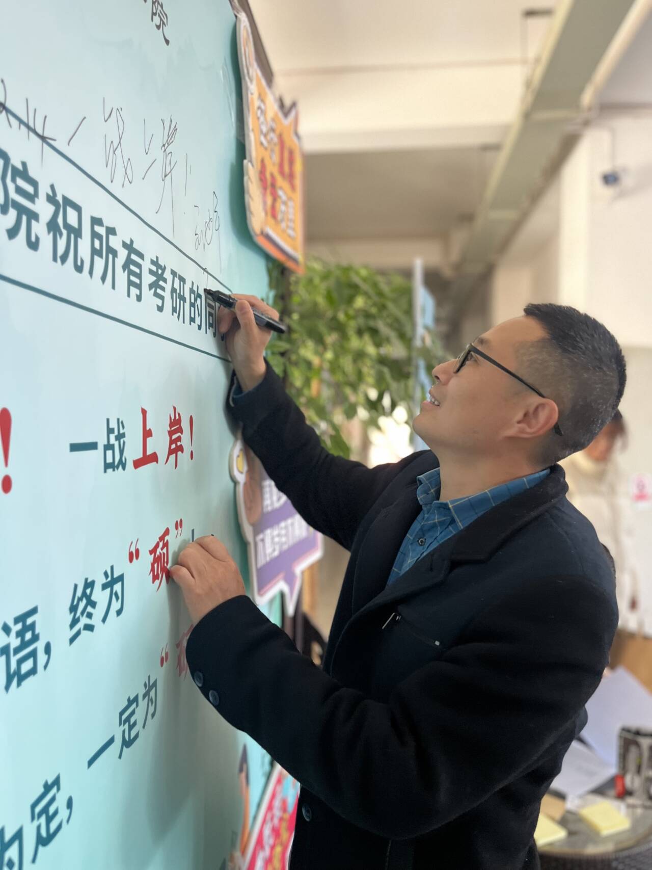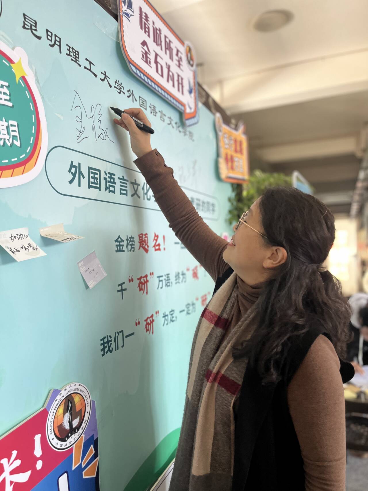 师生将美好的祝福写在便利贴和宣传展板上,为考研学子加油打气。