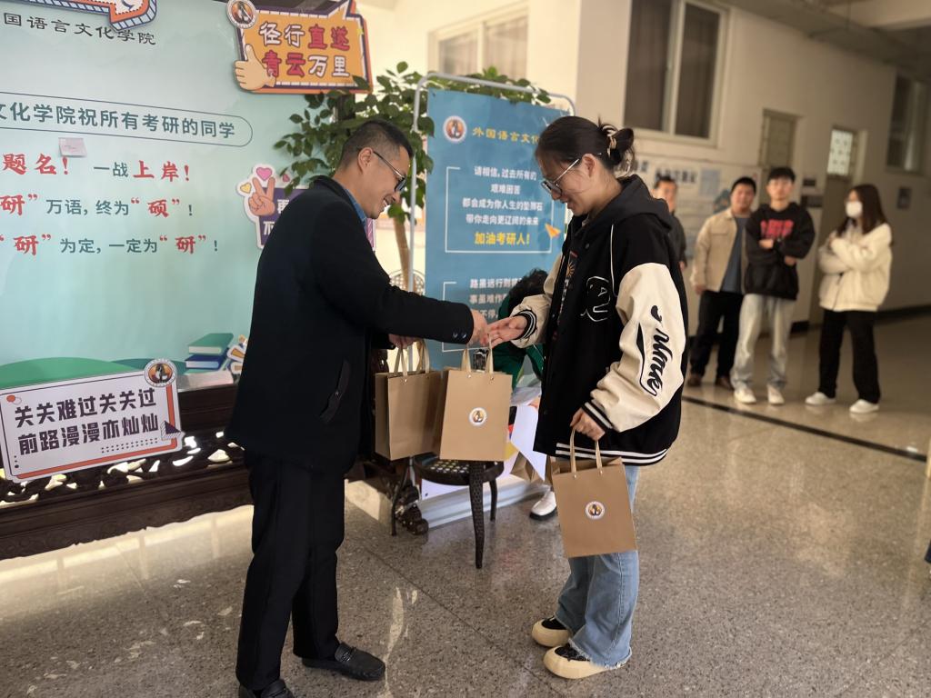 领导和老师与到场学生代表进行交流,亲切问询学生的备考情况,为考研学子送上慰问礼包。本次活动准备共计70余份慰问礼包,发放礼品包含考试文具、祝福书签等,为考研学子送去冬日的温暖祝福。博文楼一楼设考研加油站,杏吧原创