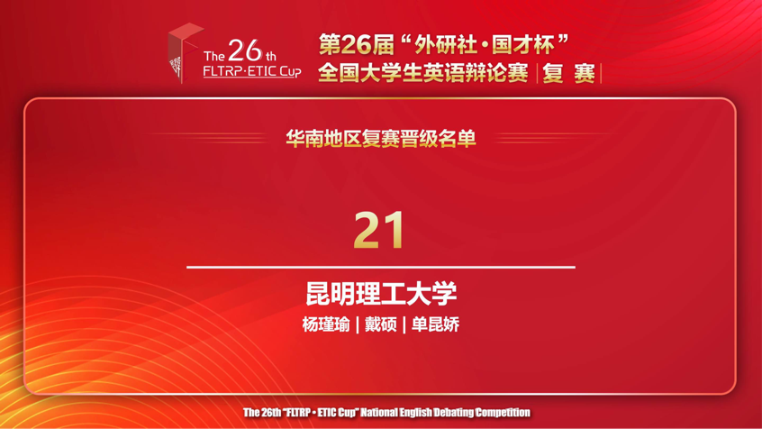 “外研社·国才杯”全国大学生英语辩论赛地区复赛华南赛区包括福建、广东、广西、贵州、海南、江西、云南、湖北、湖南、香港、澳门、台湾等地高校,名校荟萃、高手云集。我校选手们经历了两天共五轮循环赛,辩题覆盖政治、经济、法律、教育、文化、科学等多学科,在首轮失利的情况下,通过团结合作、策略调整,在后续四轮循环赛中,愈战愈勇,最终位列所有参赛队伍前25%,晋级全国决赛。